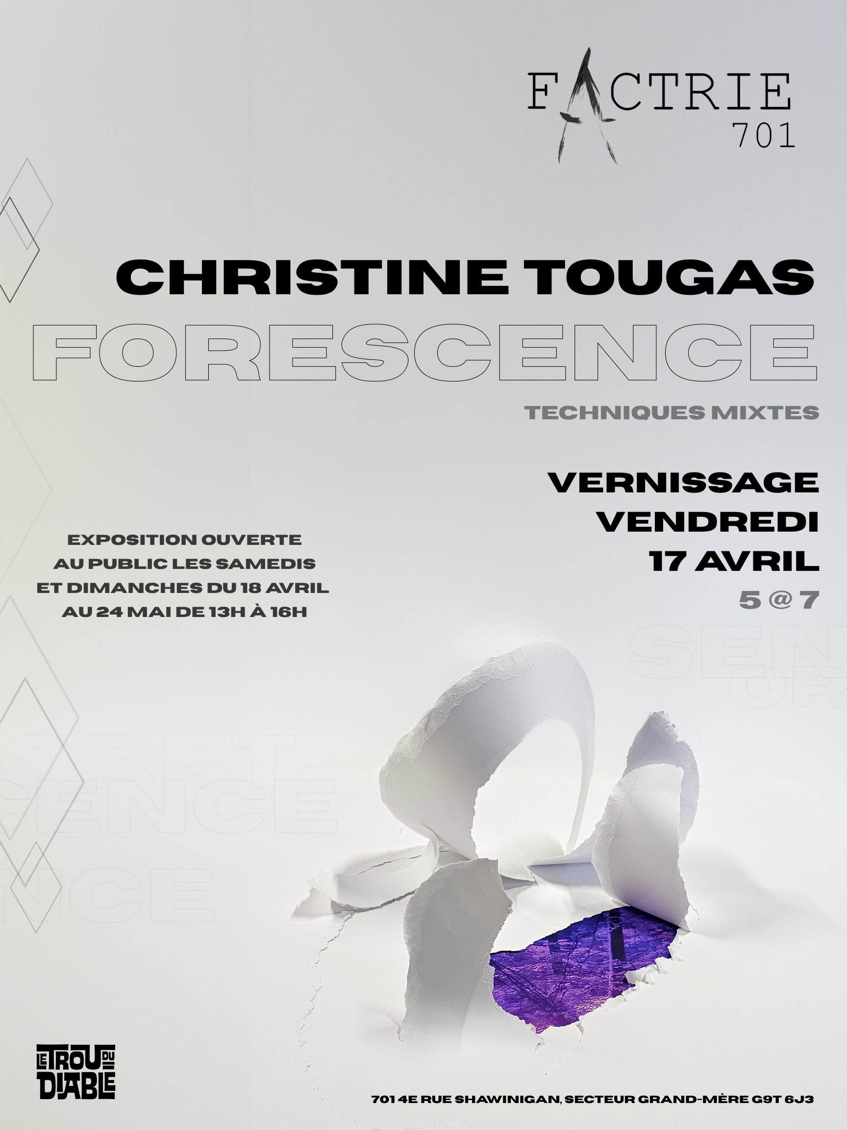 Vernissage (ouvert au public) : vendredi 17 avril 2026 en formule 5 à 7